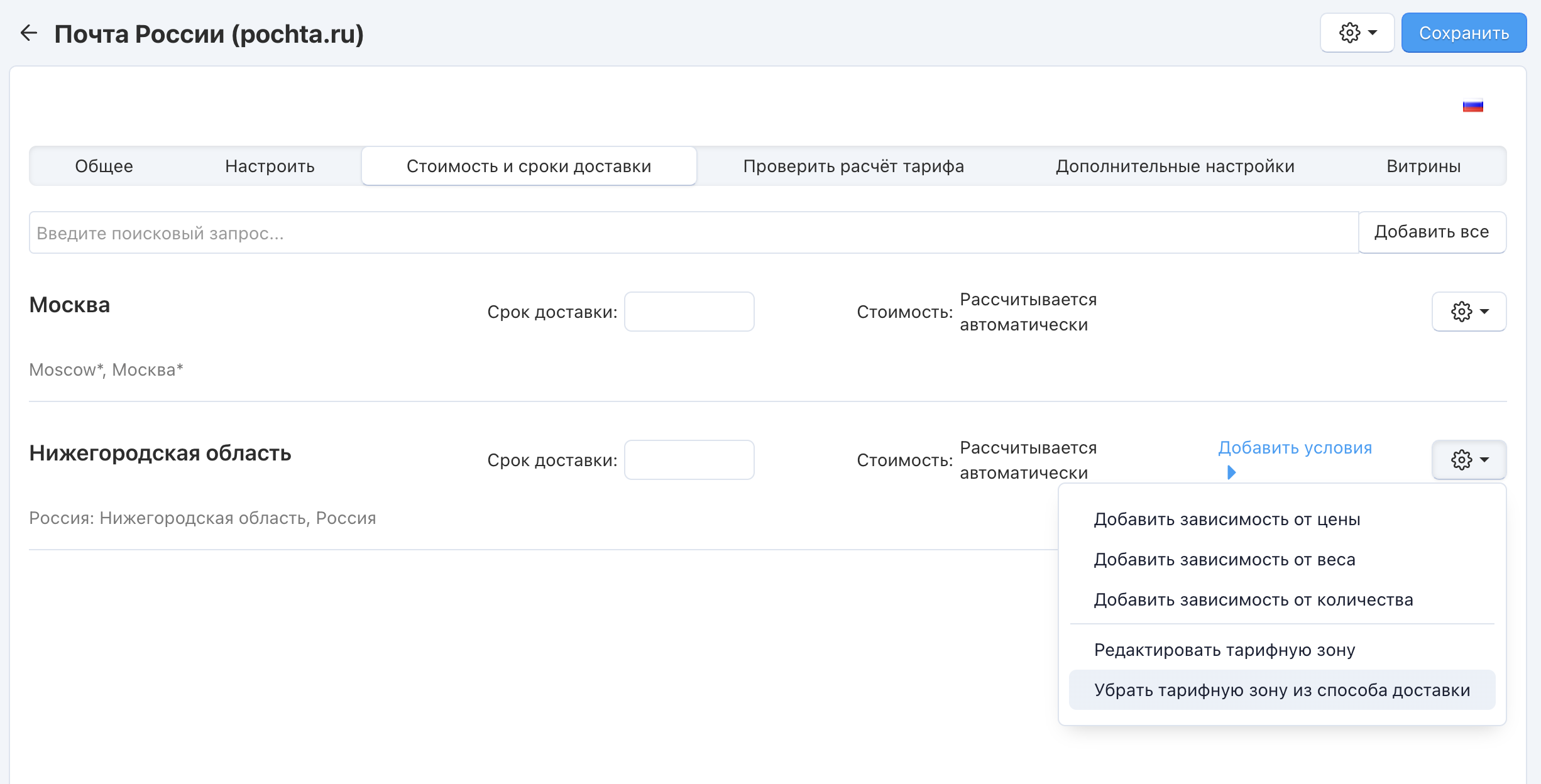 2. Создайте тарифные зоны отдельно для Российской Федерации и Москвы. Таким образом вы “исключите” Москву из тарифной зоны Российская Федерация, чтобы привязать эти зоны к разным способам доставки.