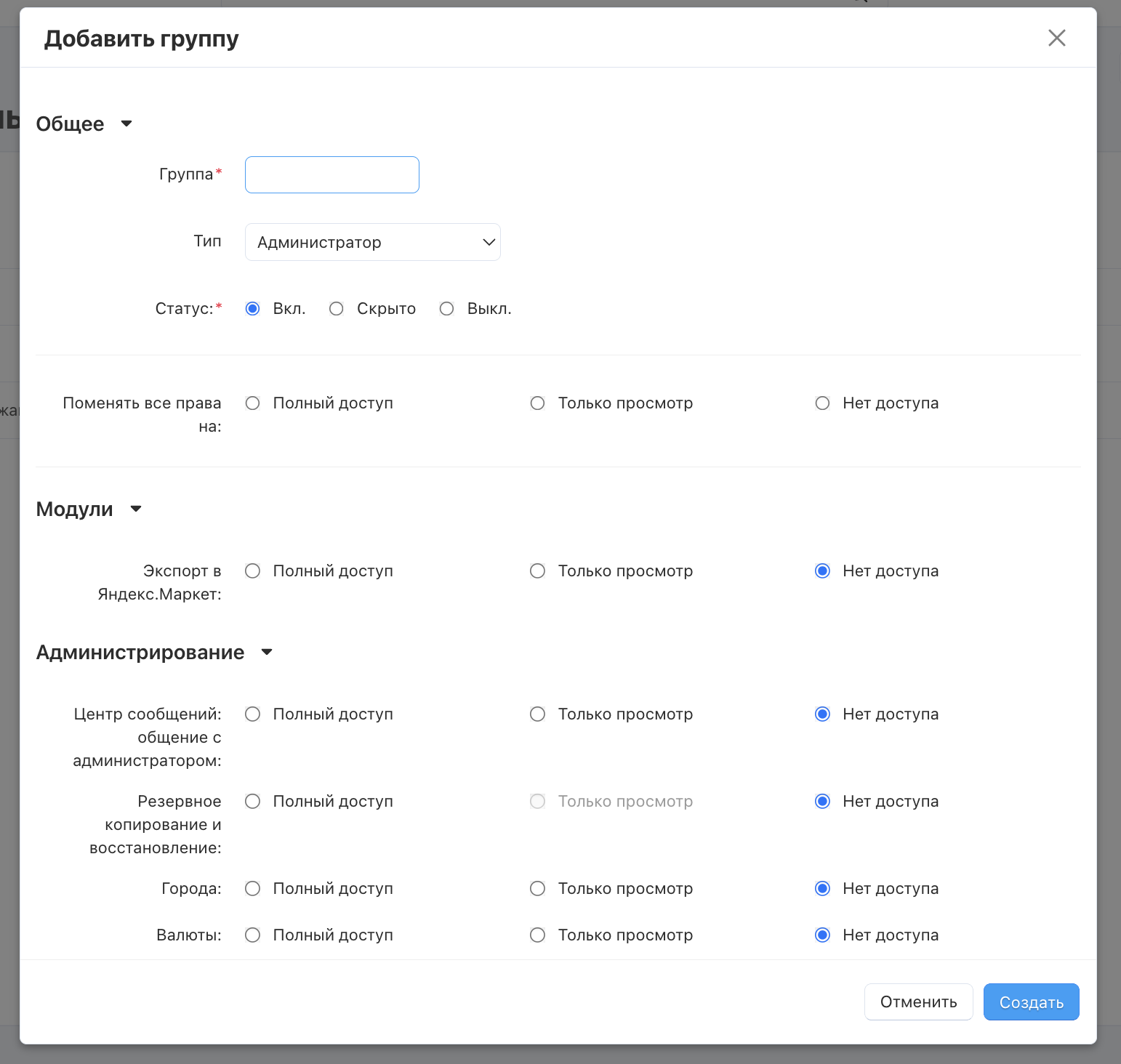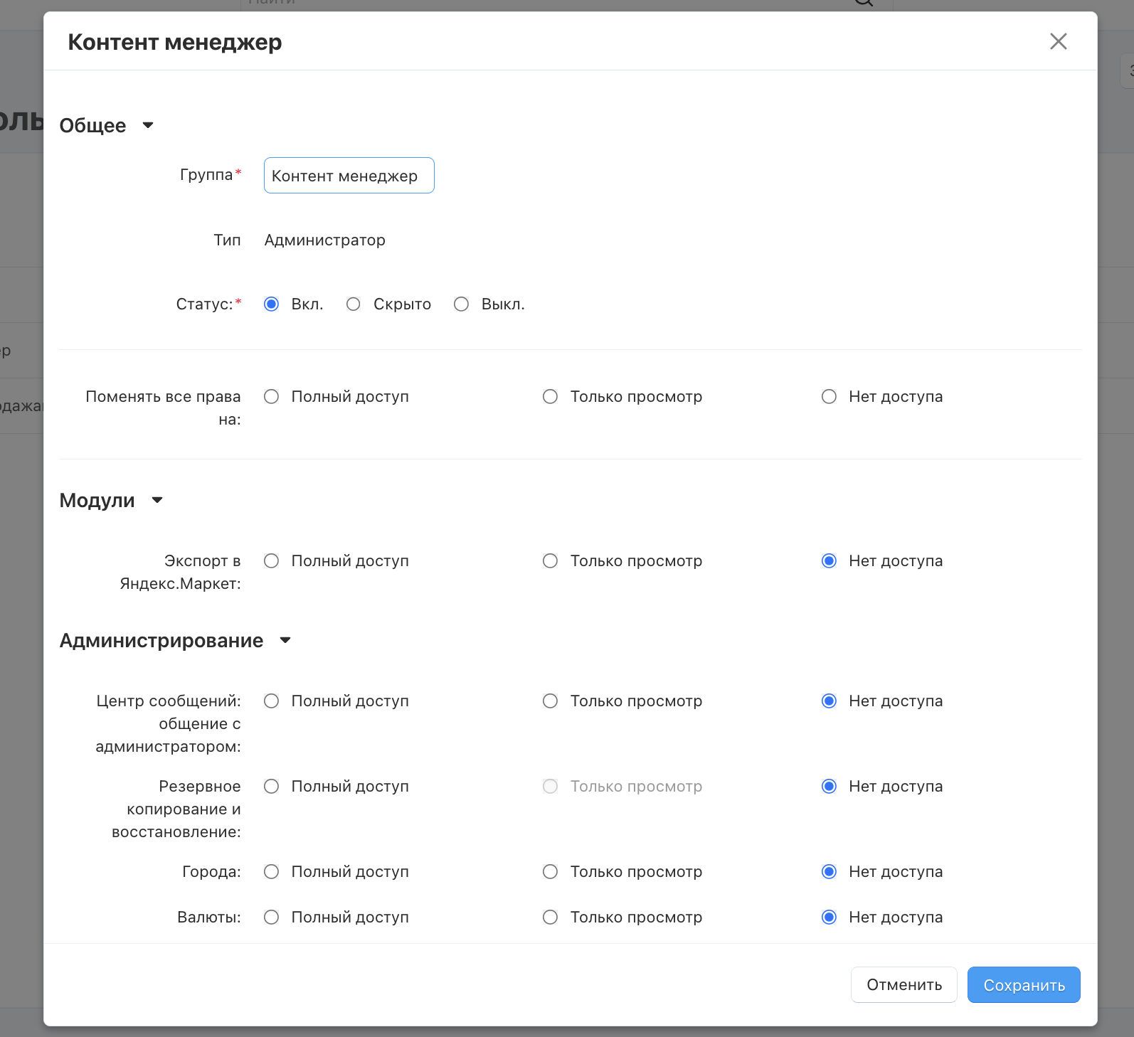 Администраторы не всегда должны иметь полный доступ к управлению магазином. Чтобы ограничить права некоторых администраторов, назначим им группу с ограниченными правами.