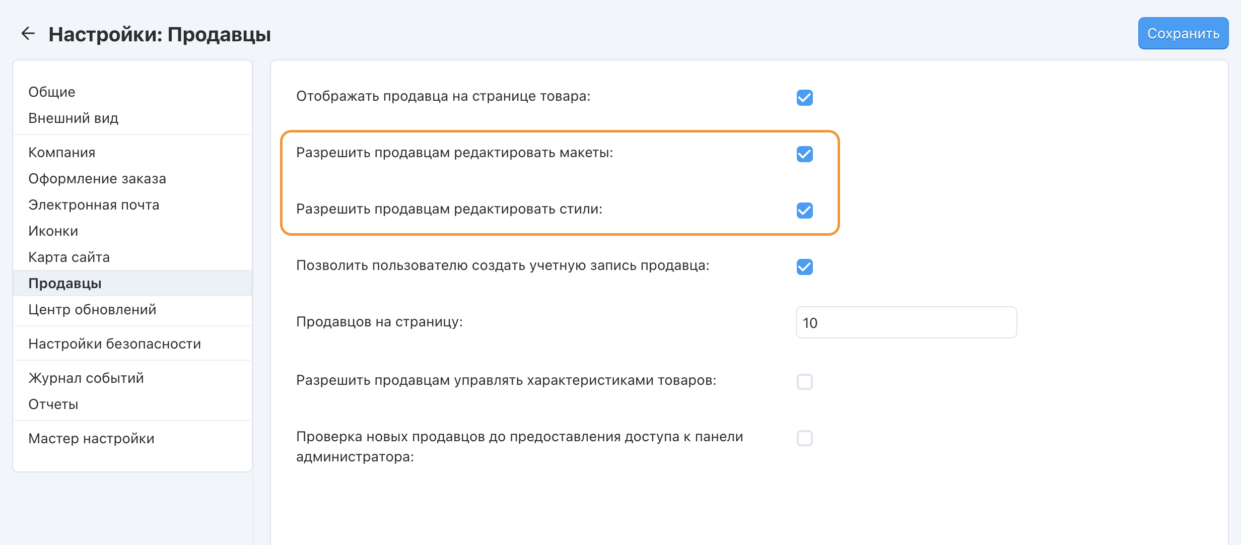 - Разрешить продавцам редактировать макеты — позволяет продавцам редактировать страницы макета.