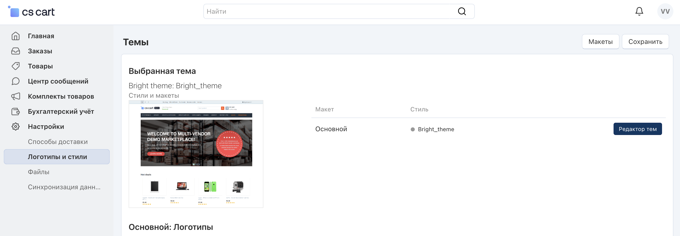 Откройте страницу Настройки → Логотипы и стили и нажмите кнопку Редактор тем.