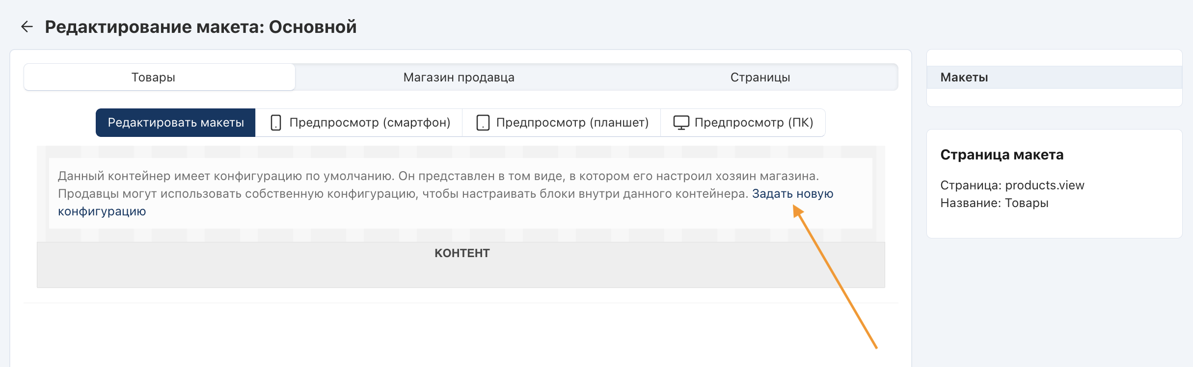 Во вкладках вы увидите страницы макета, которые могут редактировать продавцы. Обратите внимание, что для редактирования продавцам доступны не все контейнеры, а только Контент.