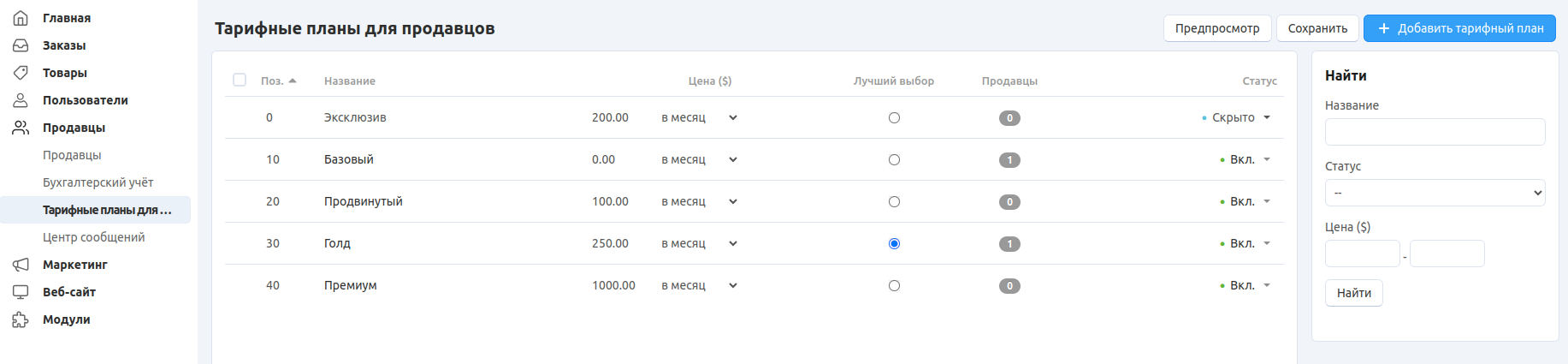 Для управления тарифными планами перейдите в меню Продавцы → Тарифные планы для продавцов в панели администратора вашего магазина. Всё, что описано ниже, происходит на этой странице.