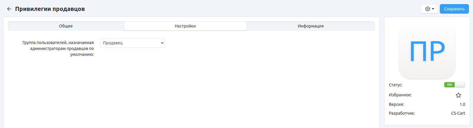 Откроются настройки модуля. Настройка Группа пользователей, назначаемая администраторам продавцов по умолчанию автоматически добавляет всех новых администраторов продавцов в выбранную группу.