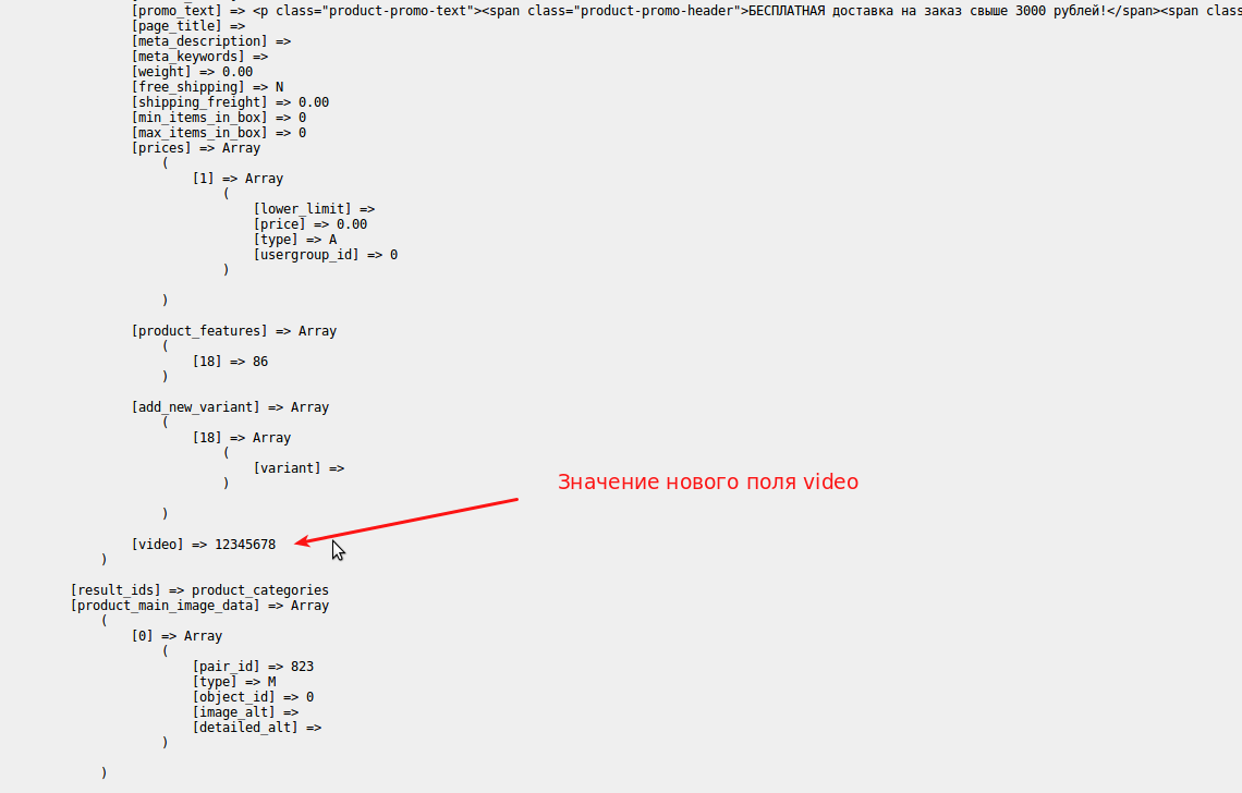 Это значит код видео должен быть в ячейке video массива product_data переменной $_REQUEST.