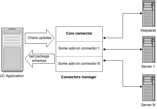 Upgrade Center App посылает запрос на проверку обновлений. Connector manager получает список всех доступных коннекторов. Каждый коннектор (реализующий интерфейс IConnector) должен вернуть массив с информацией о подключении к своеу серверу обновлений (каждый коннектор может добавлять любые данные, которые нужно отправить на сервер).