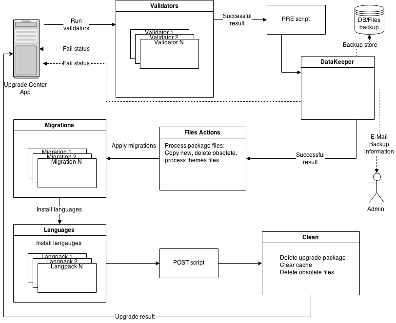 Каждый шаг установки обновления логгируется в файл var/upgrade/[NAME]_log.txt, где NAMEcore или название модуля. В случае непредвиденной остановки обновления всегда можно узнать причину.