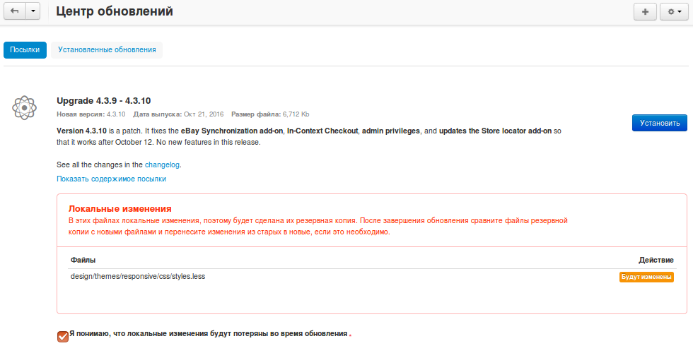 2.7. При обновлении вы увидите список файлов, которые в вашем магазине были изменены вручную. Эти файлы будут зарезервированы, чтобы потом вы могли внести свои изменения вручную. Поставьте галочку Я понимаю, что локальные изменения будут потеряны во время обновления и нажмите кнопку Установить.