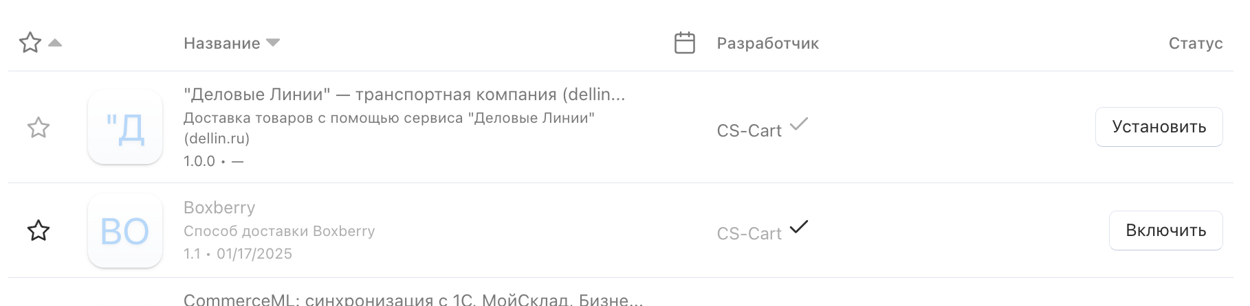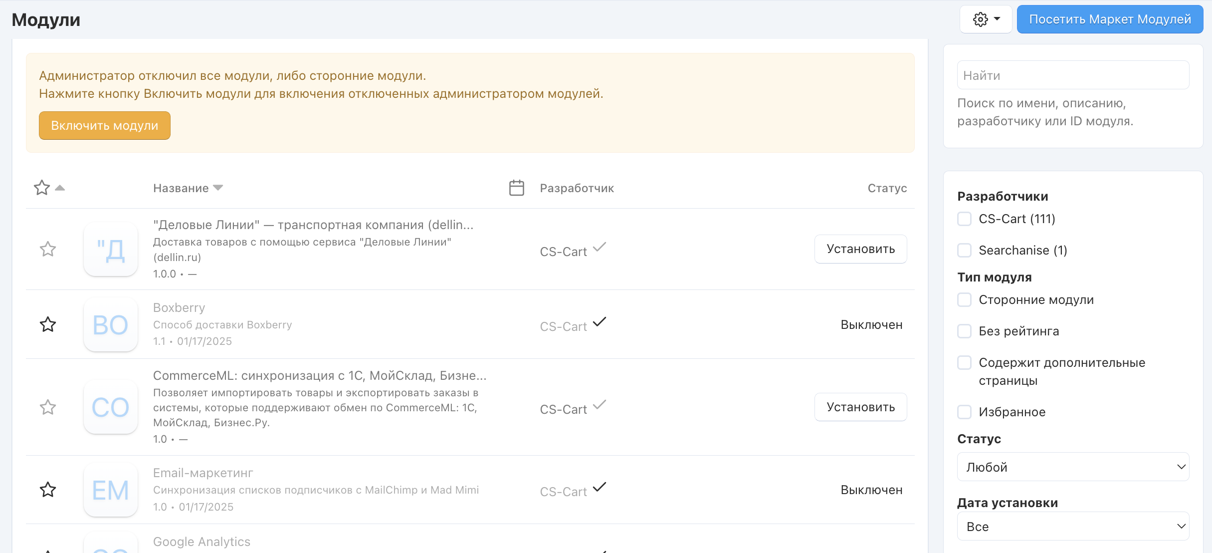 Страница “Управление модулями” содержит информацию о модулях вашего интернет-магазина. На данной странице вы можете: