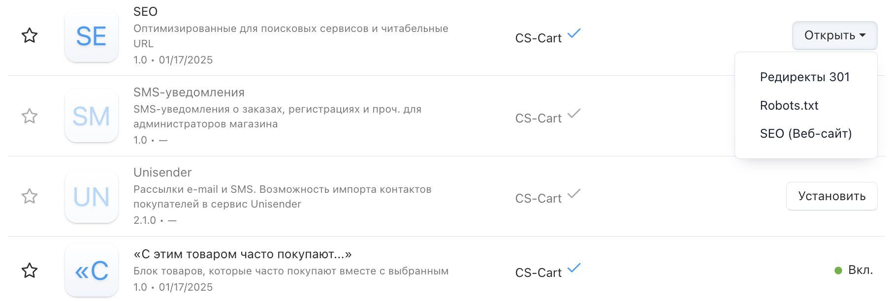 CS-Cart из коробки дает в распоряжение более 90 модулей. Часть из них сразу установлены — эти модули, с нашей точки зрения, необходимые любому интернет-магазину. Некоторые модули не установлены, чтобы не перегружать магазин ненужным на данный момент функционалом.