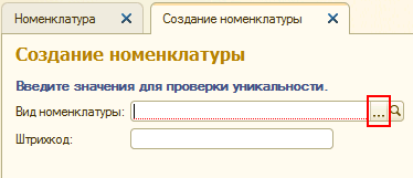 В окне создания новой номенклатуры нажмите на кнопку ”...” у поля “Вид номенклатуры”.