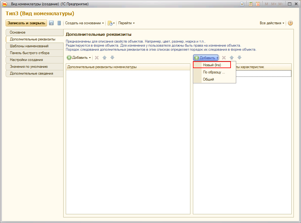 В этом же окне “Вид номенклатуры” перейдите во вкладку “Дополнительные реквизиты” и добавьте в список “Дополнительные реквизиты характеристик” нажав на кнопку “Добавить” → “Новый (Ins)”.