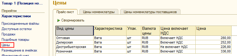 Если открыть товары, для которых была установлена цена (меню “Продажи” → ссылка “Номенклатуры”) и нажать на ссылку “Цены”, то у товара должен появиться список установленных цен.
