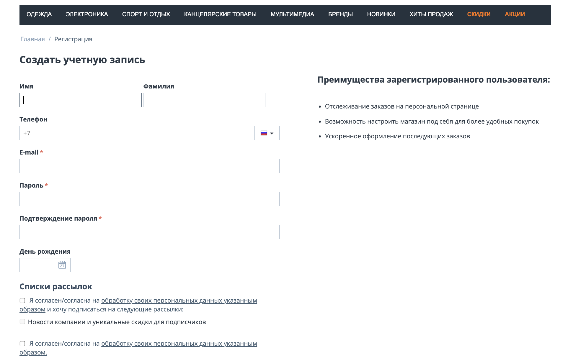 • Флажки согласия на обработку данных, которые могут отображаться в стандартных местах сбора персональных данных (например, при оформлении заказа, регистрации, подписке на рассылку и т. д.).