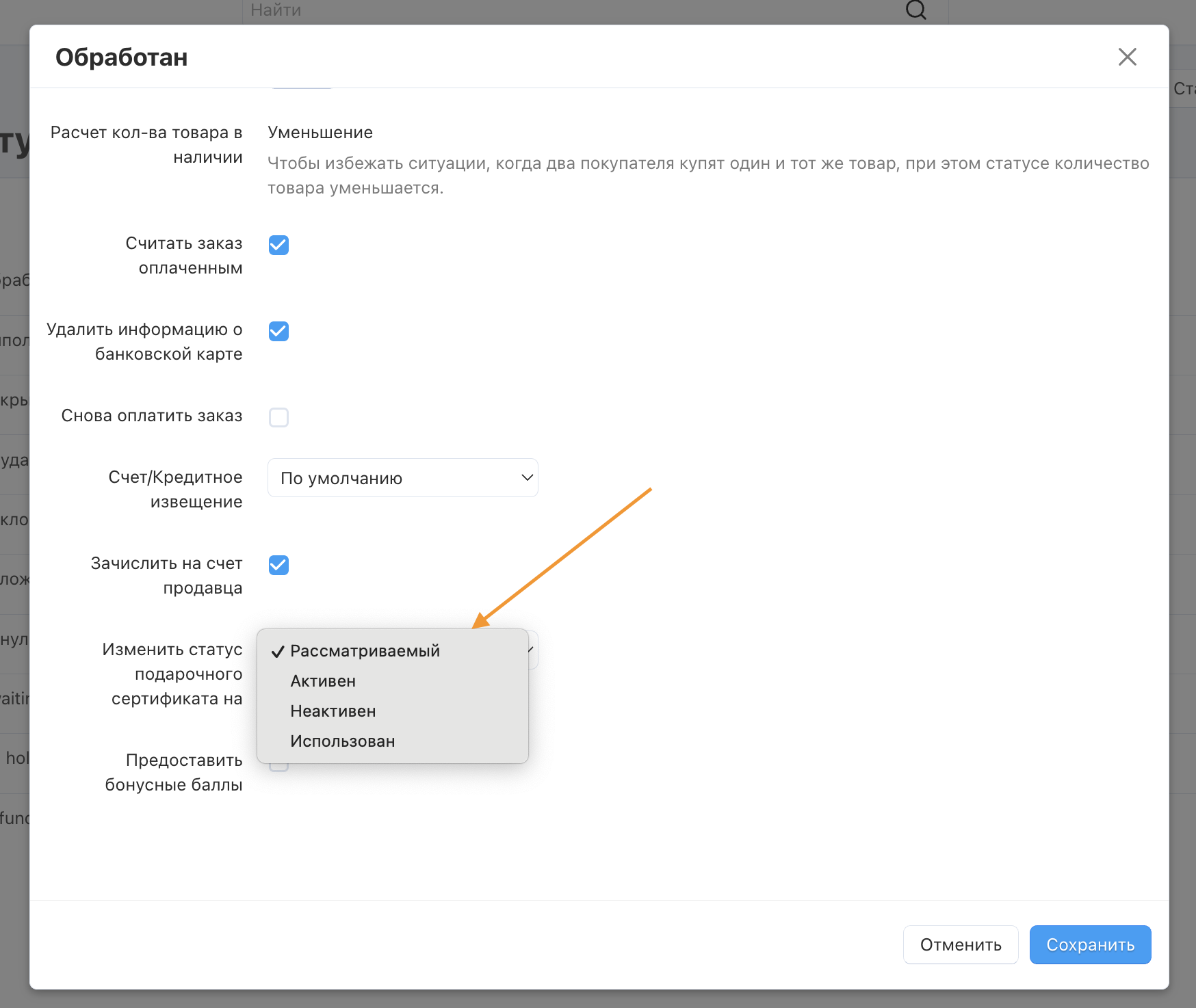 Задайте нужное значение для настройки Изменить статус подарочного сертификата на.