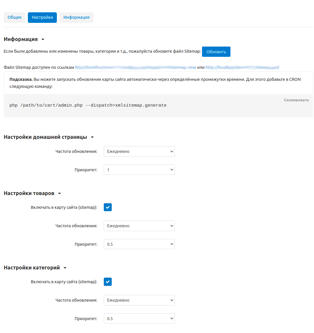 Если были добавлены или изменены товары, категории и т.д., обновите файл Sitemap, нажав на кнопку Обновить в настройках модуля Карта сайта для Yandex и Google, чтобы обновить xml файл карты сайта.