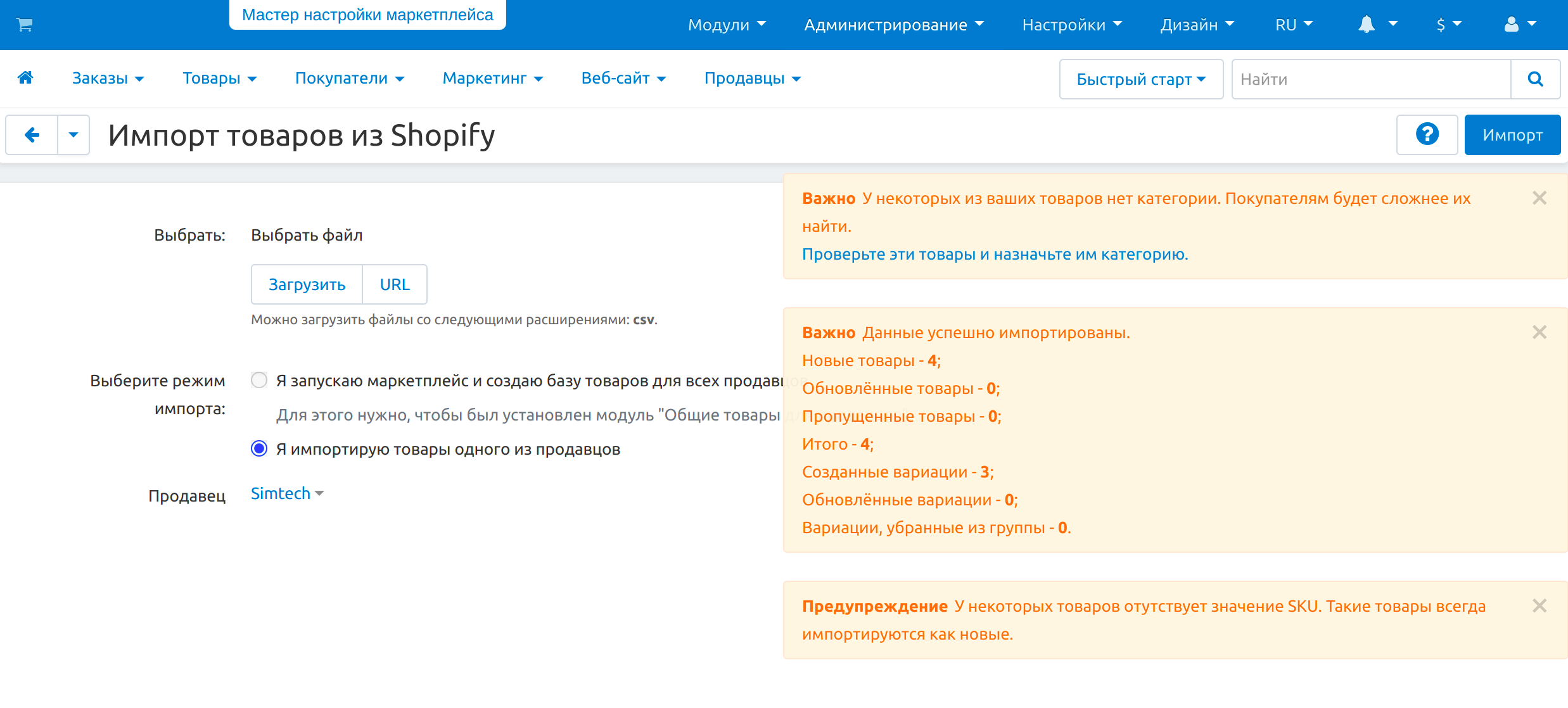 - Импортировать сразу все товары — удобно для тех, кто только запускает маркетплейс. Импортированные товары становятся общими, поэтому режим активен только при включенном модуле “Общие товары для продавцов”.