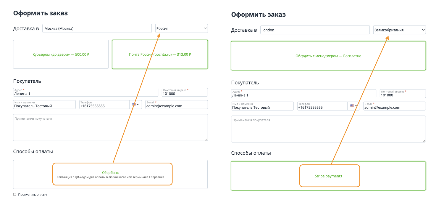 Функция “Способы оплаты в зависимости от страны” позволяет вам настраивать доступные способы оплаты для разных стран. Если вы продаете товары в нескольких странах, вы можете настроить для них разные способы оплаты. Например, вы можете отображать Сбербанк для России и Платежи через Stripe для Европы.