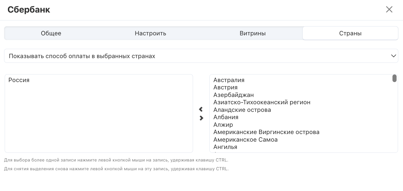 • Показывать способ оплаты в выбранных странах - при выборе этого варианта покупатели из выбранных стран будут видеть способ оплаты, а для остальных стран он будет недоступен.