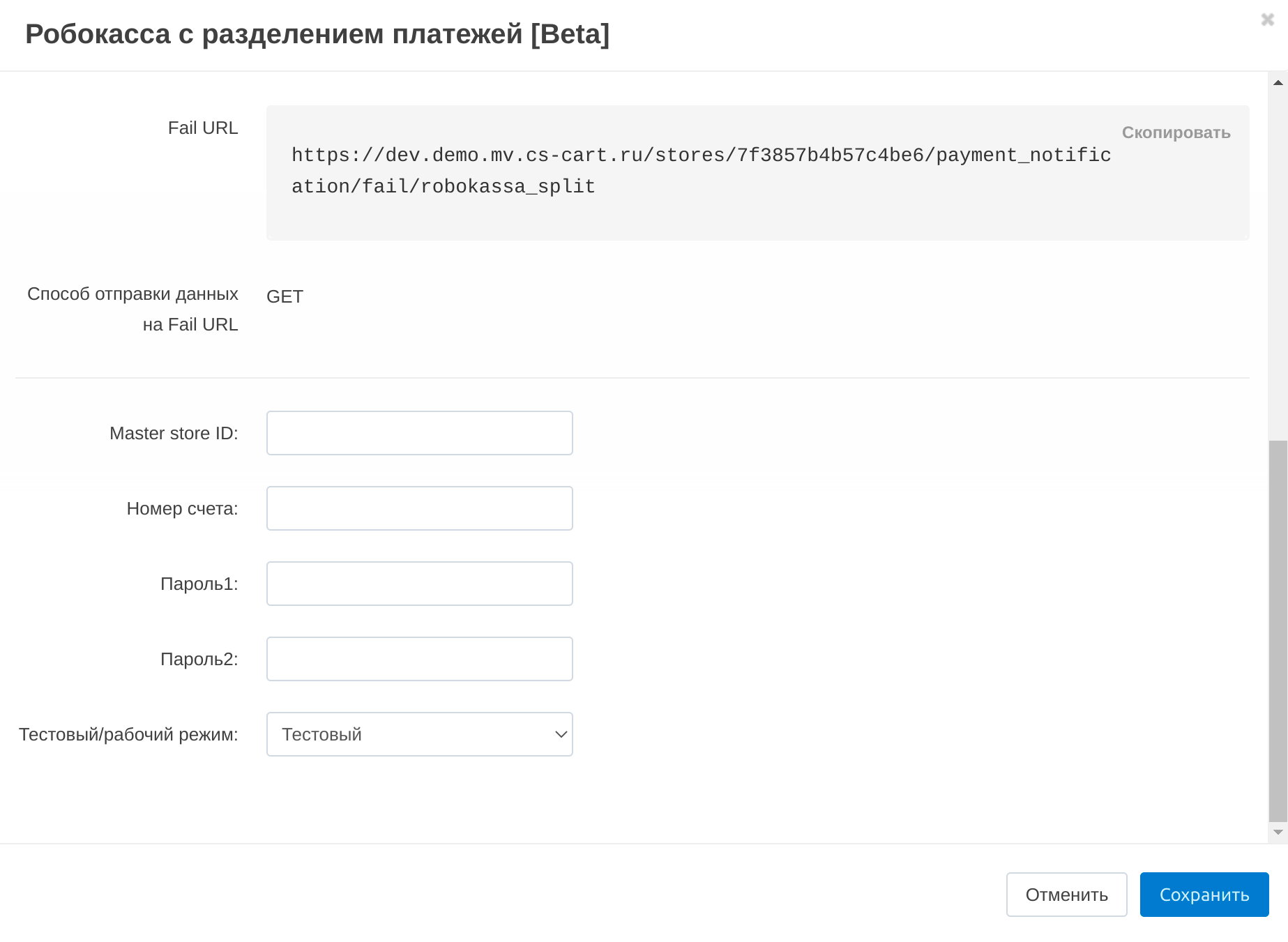 • Повторите эти действия с полями Success URL и Fail URL.