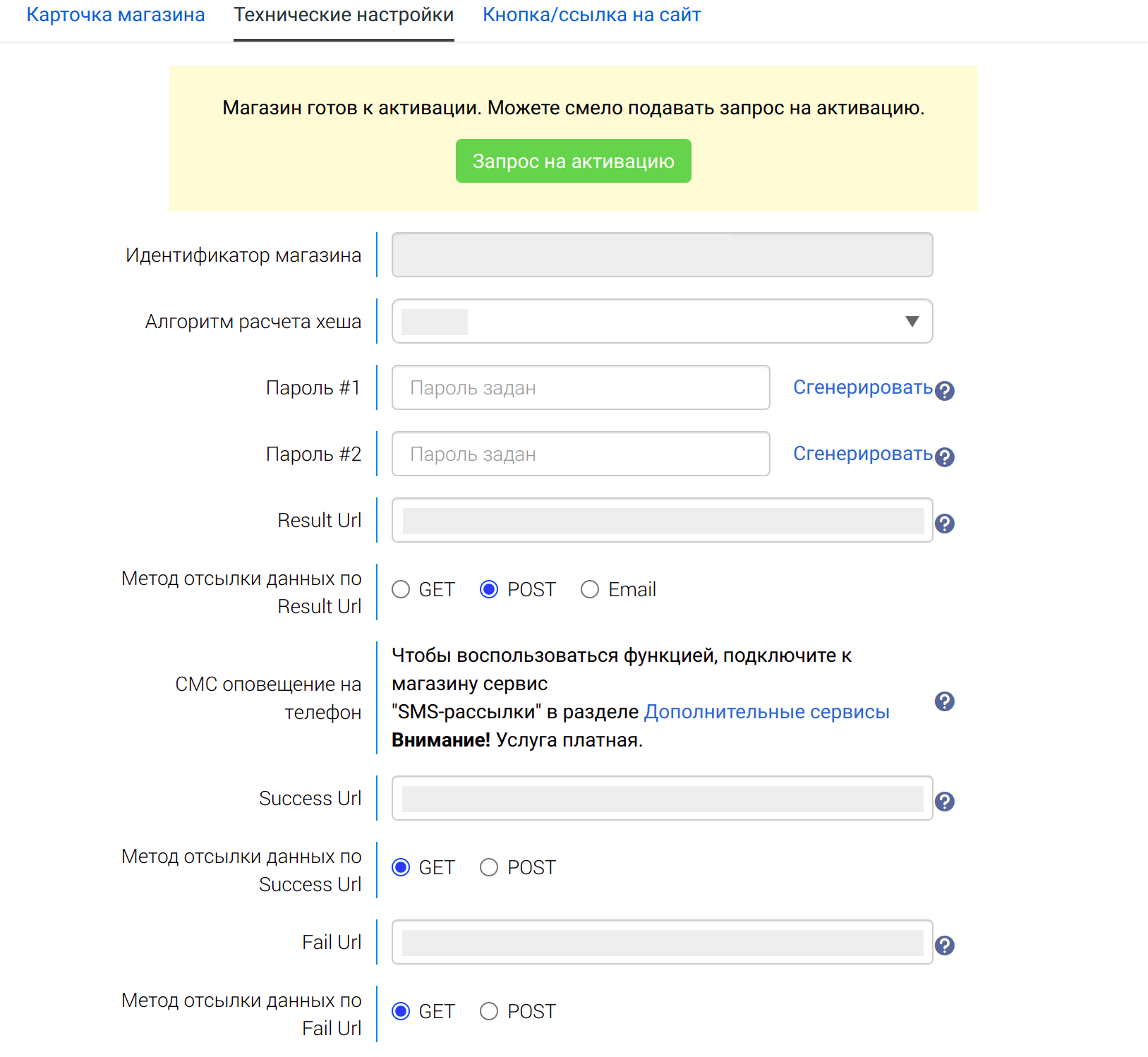 • Укажите Метод отсылки данных по Result Url такой, как в вашем маркетпелйсе.