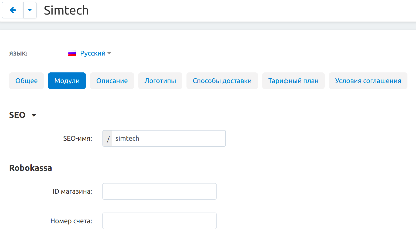 Чтобы оплата и сплитование работали корректно, подключите продавцов к Robokassa. Для этого перейдите в профиль продавца, щелкнув по его названию на странице Продавцы → Продавцы в панели администратора. Откройте вкладку Модули и в разделе Robokassa укажите данные из технических настроек магазина в Robokassa (те же, что указывали при настройке способа оплаты): ID магазина, т.е. Идентификатор магазина, и Номер счета. Нажмите Сохранить.