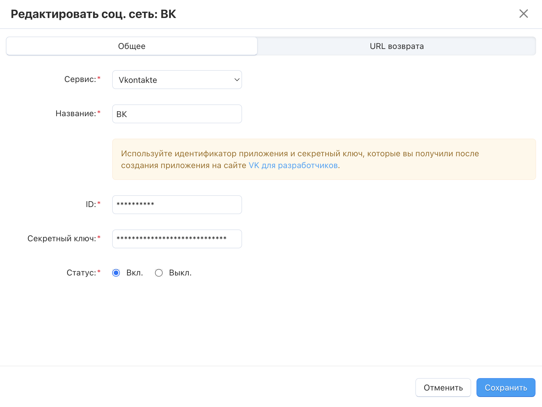 Создайте нового провайдера (сервис) с помощью кнопки + Добавить соц. сеть.