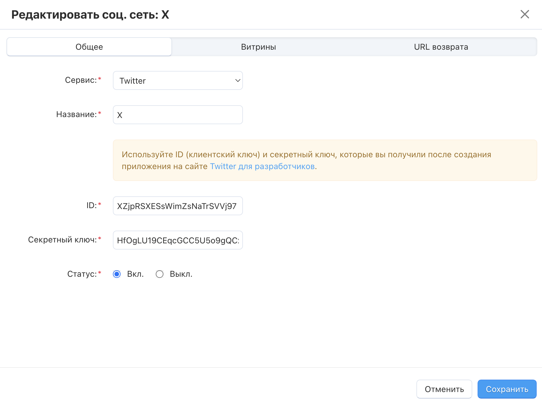 - Создайте нового провайдера для сервиса «Twitter» в панели администратора. И используйте API Key и API Key Secret в полях ID и Секретный ключ.
