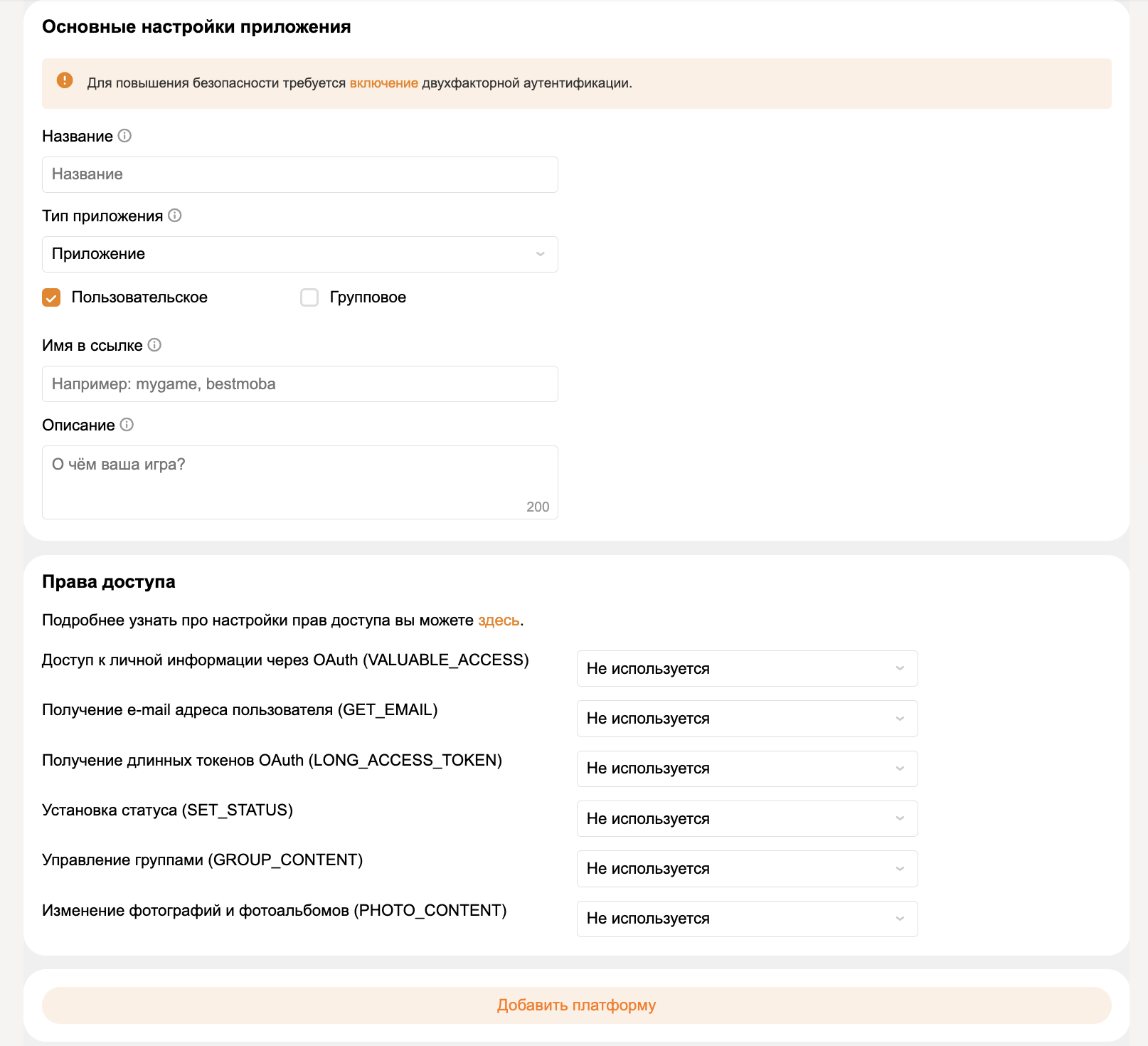 Заполните необходимые настройки для нового приложения, и установите платформу OAuth. В настройке вам может помочь инструкция по созданию приложения от сервиса.