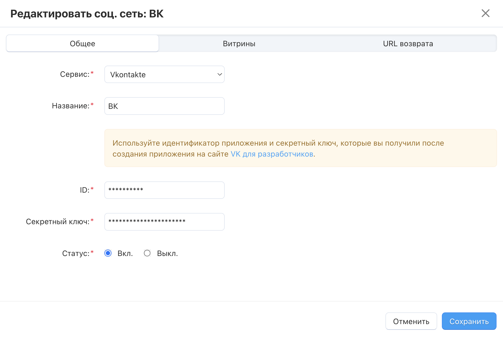 В панели администратора CS-Cart перейдите на страницу Настройки → Вход через соц.сети. Добавьте провайдера и выберите ему сервис Vkontakte.