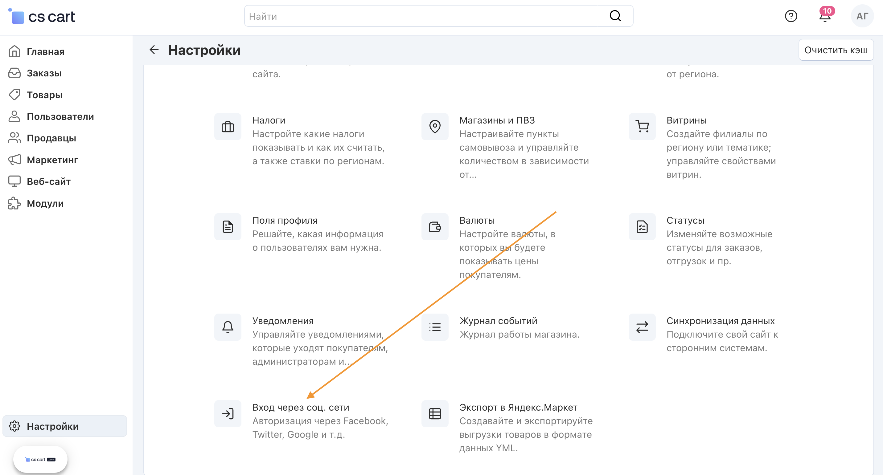 Установите модуль «Вход через соцсети» в панели администратора, а также “Вход через соцсети: российские социальные сети”, чтобы подключить российские социальные сети.