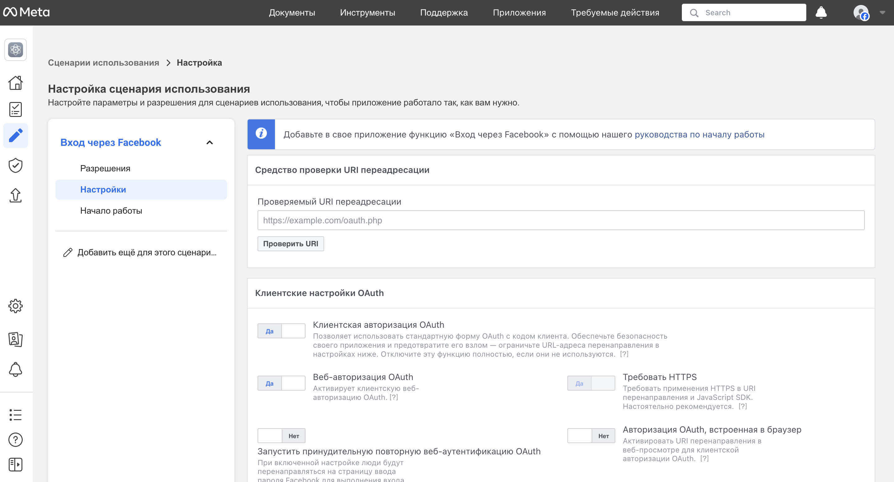 Откройте настройки сценария использования Вход через Facebook. Там нужно будет заполнить значение настройки Действительные URI перенаправления для OAuth — скопируйте это значение из настроек провайдера Facebook в панели администратора CS-Cart, а затем сохраните свои изменения на стороне Facebook.