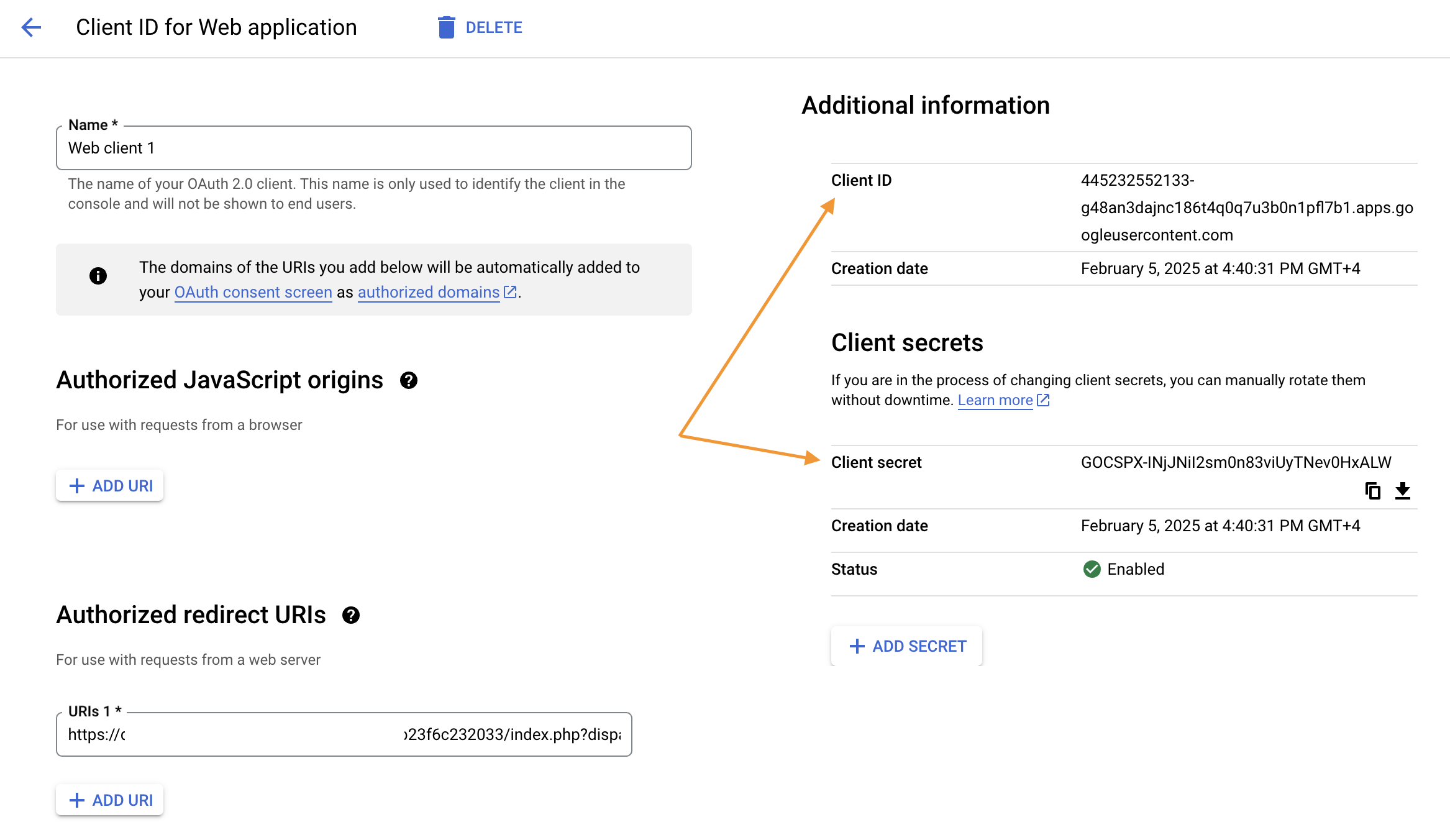 После создания учётных данных вы увидите Идентификатор клиента и Секрет клиента. Скопируйте их в настройки провайдера Google на стороне CS-Cart и сохраните изменения. После этого покупатели смогут зарегистрироваться и войти в магазин через свои учётные записи Gmail.