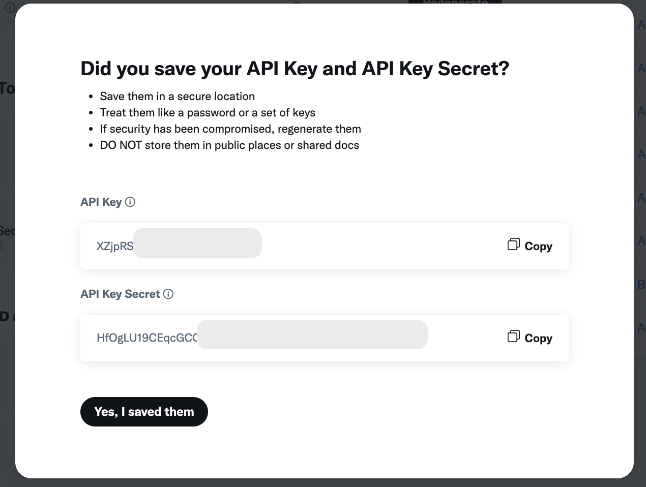 - Здесь нужно будет сгенерировать заново Consumer Keys. Для этого нажмите Regenerate, скопируйте и сохраните API Key и API Key Secret любым удобным вам способом.