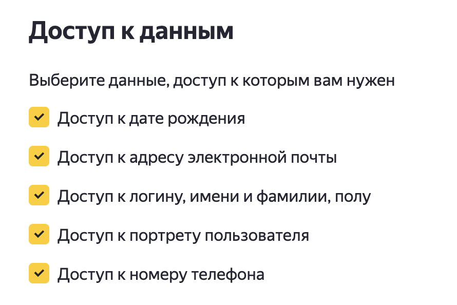 Выберите данные, доступ к которым вам нужен — здесь вы можете указать, какие данные аккаунта Яндекс будут переданы на ваш сайт.