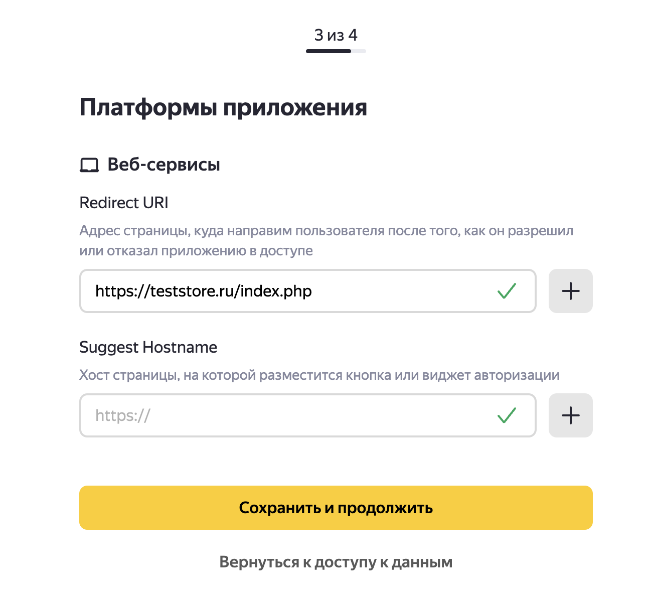 /index.php. То есть адрес должен иметь примерно такой вид: https://teststore.ru/index.php. - Suggest Hostname — Хост страницы, на которой разместится кнопка или виджет авторизации (необязательное поле)