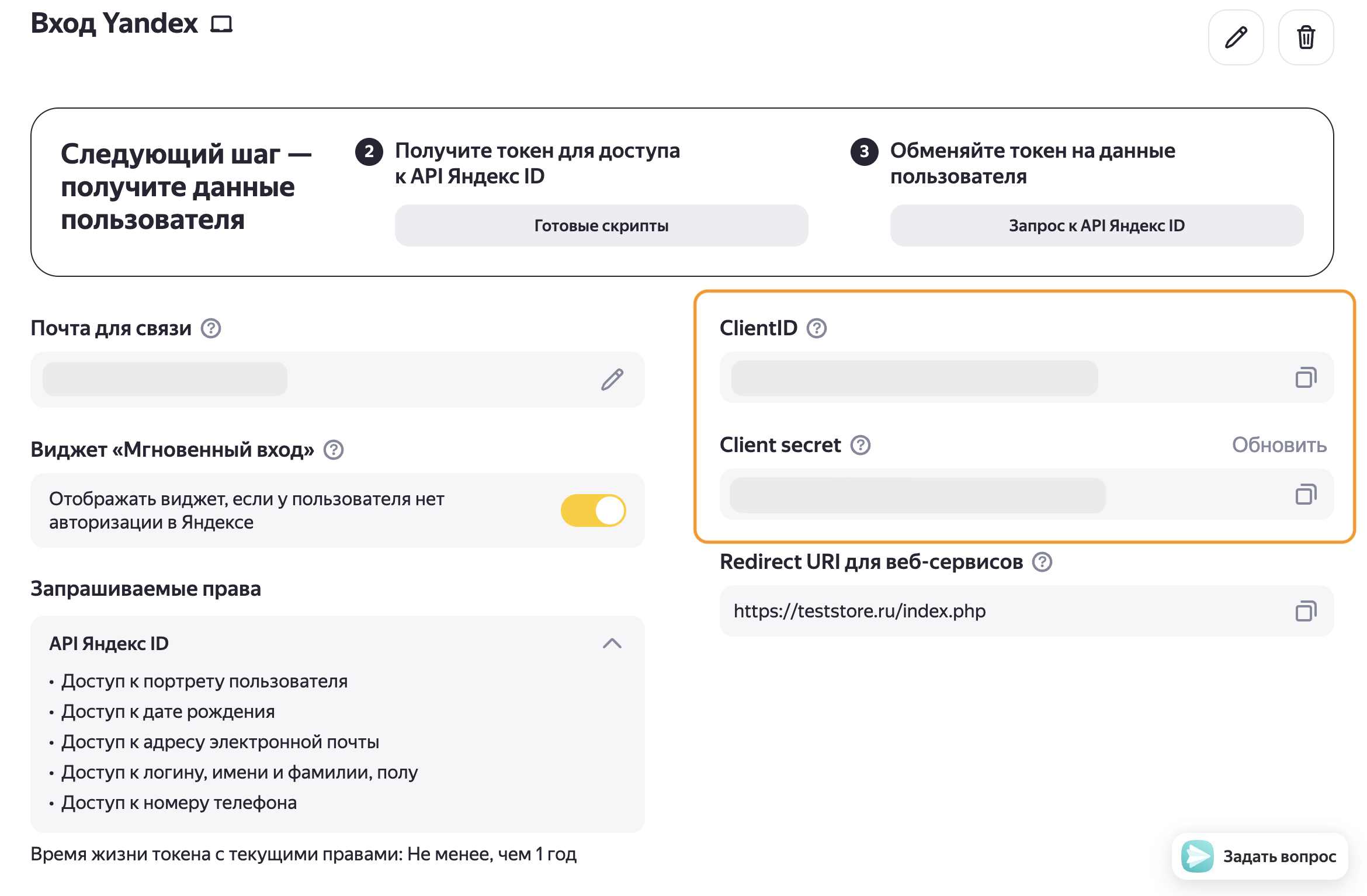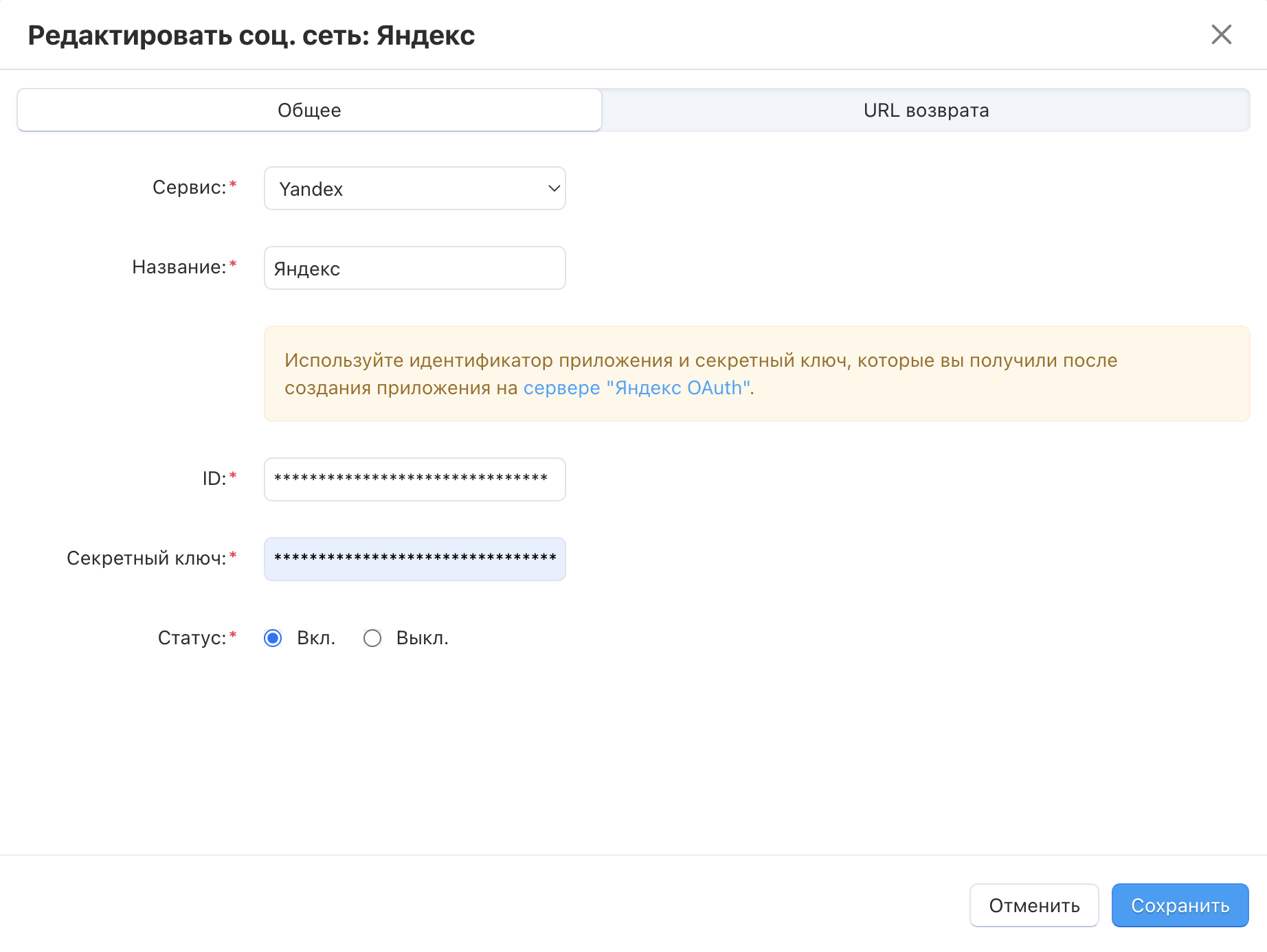 Пройдите в панель администратора и добавьте нового провайдера «Yandex». Используйте данные созданного приложения.
