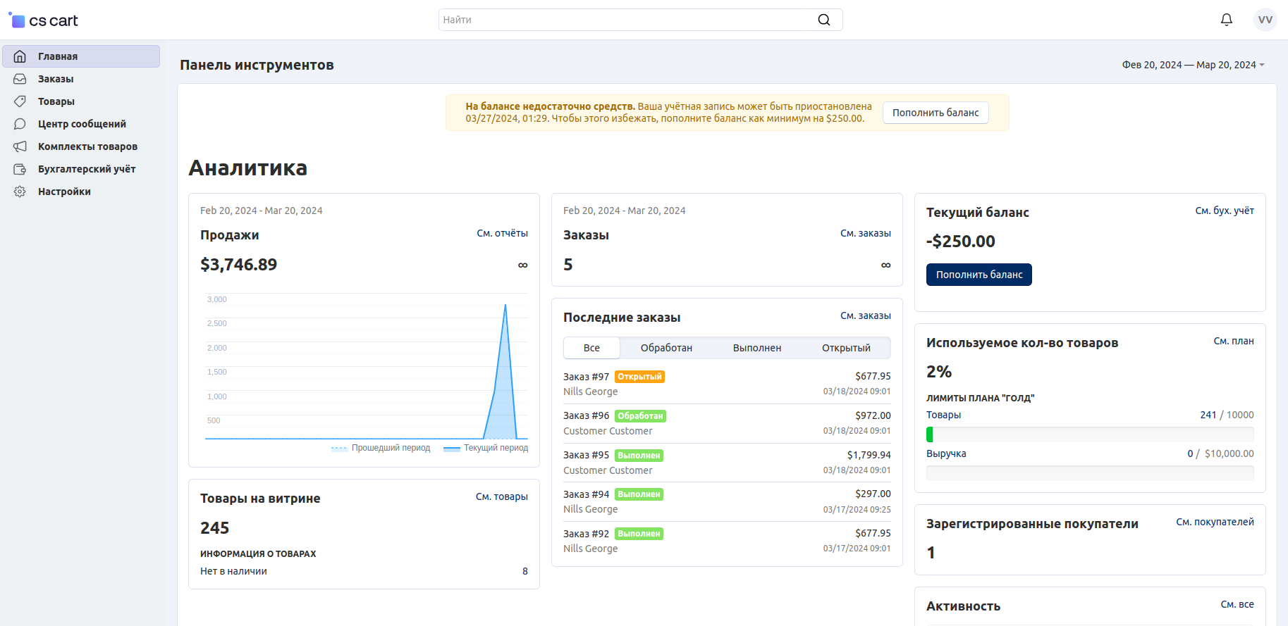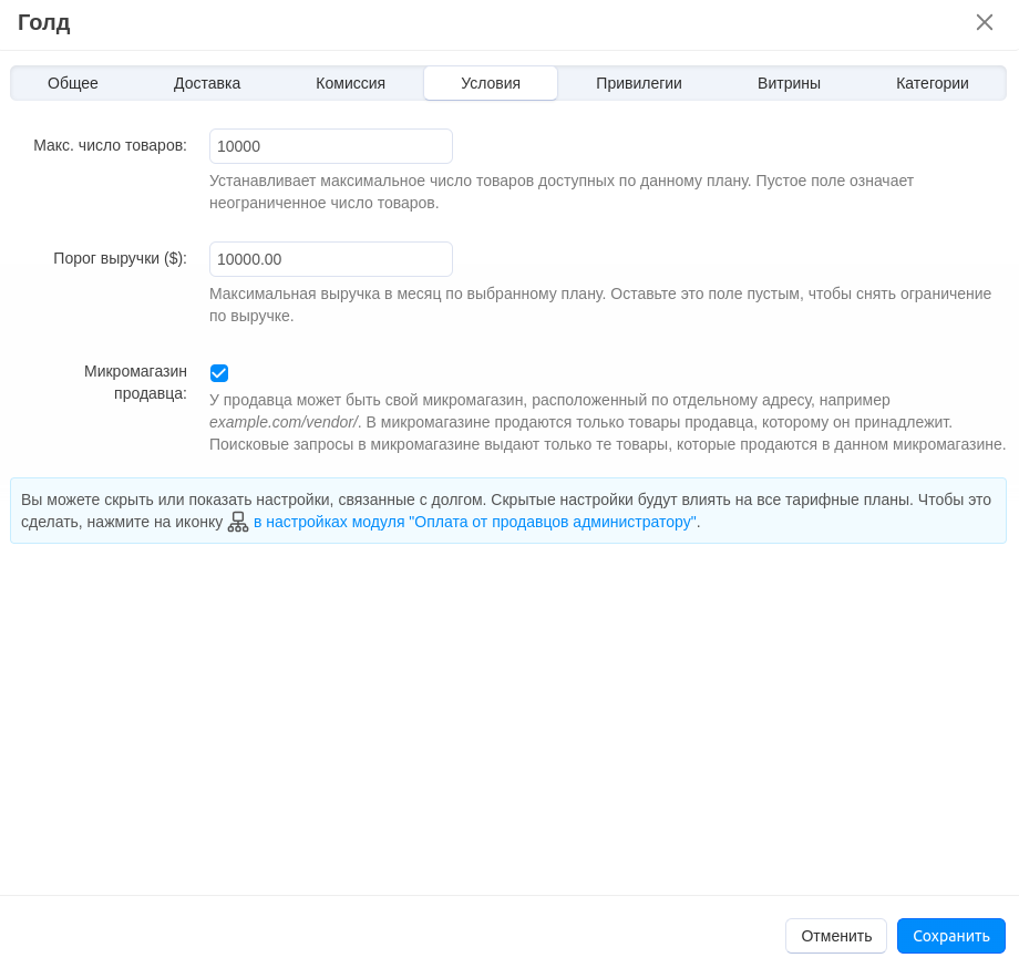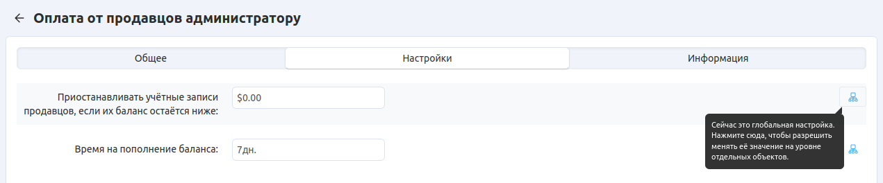 Модуль позволяет выбрать минимально разрешённый баланс для продавцов, а также срок пополнения баланса. Если баланс опустится ниже разрешённого, а продавец не пополнит его в срок, то он получит статус “Приостановлен” со всеми сопутствующими ограничениями.