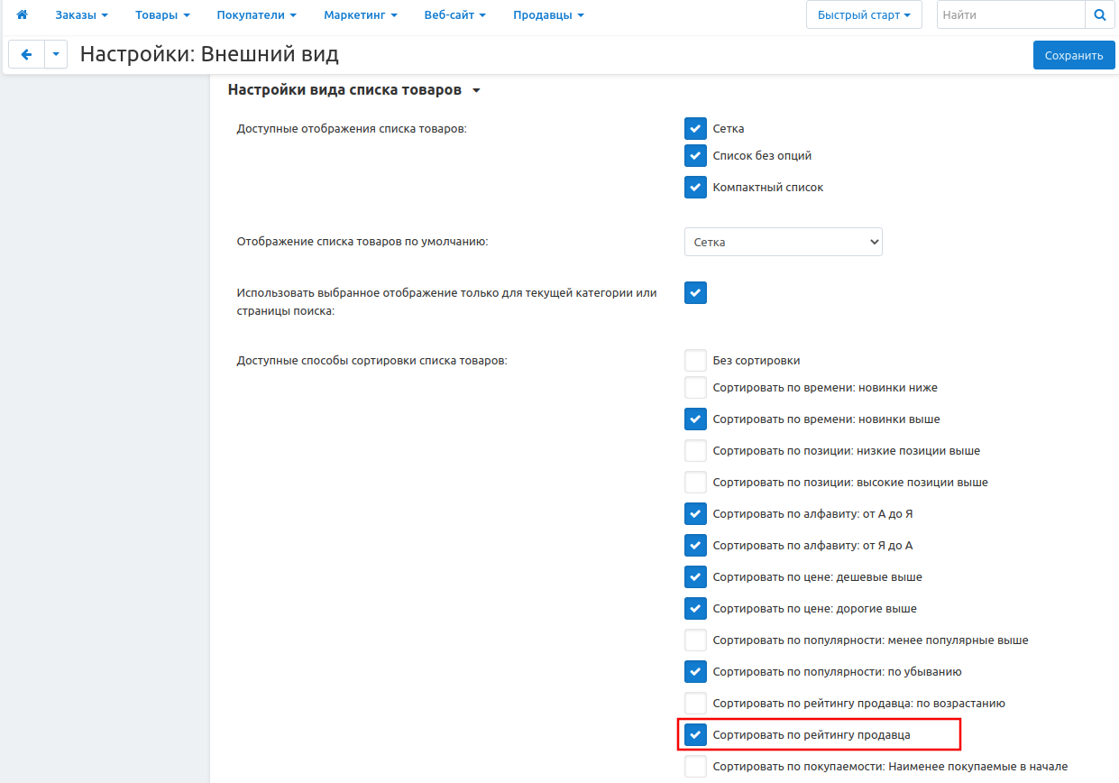 2. В разделе Настройки вида списка товаров поставьте галочку напротив Сортировать по рейтингу продавца.