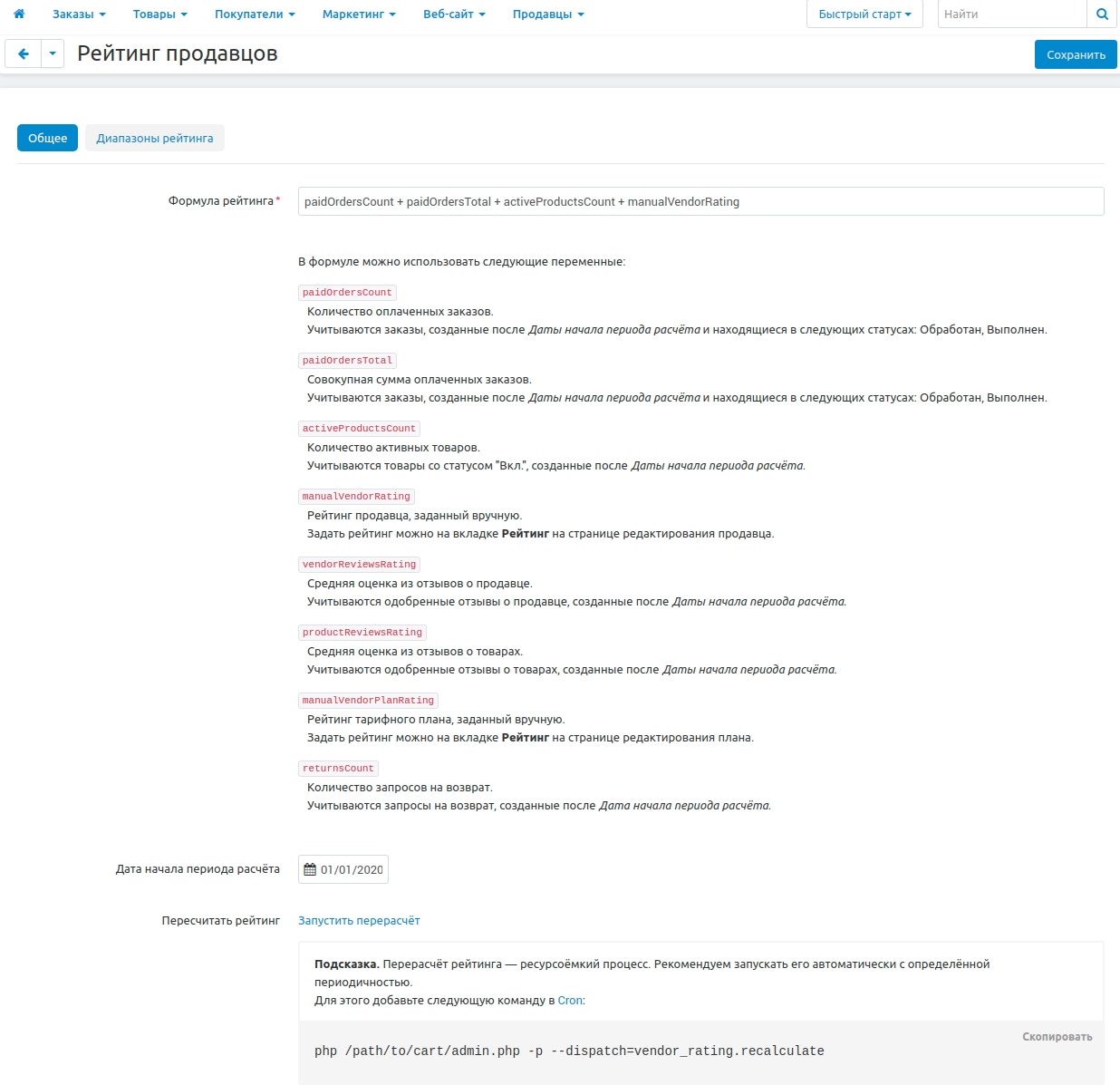 3. На вкладке Общее настройте формулу, по которой будет рассчитываться рейтинг продавцов.