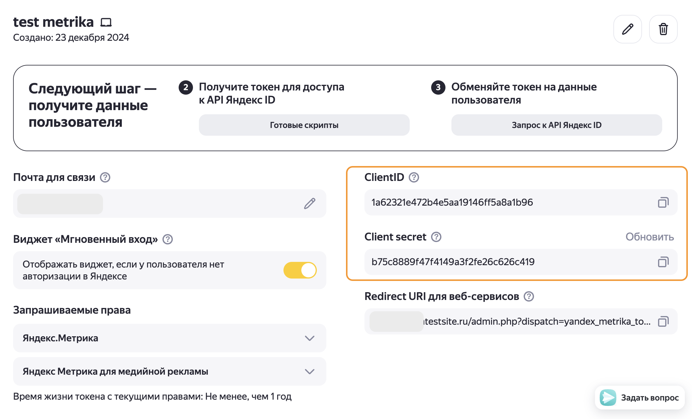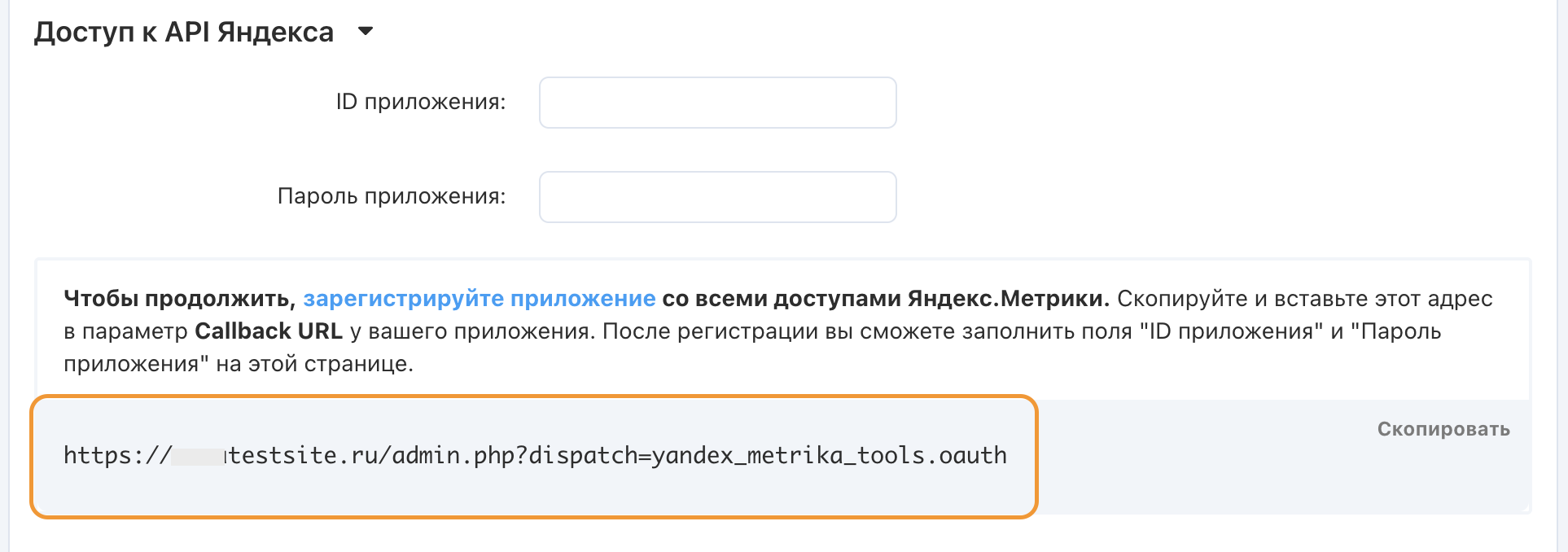 - Redirect URI — адрес, через который сервис будет связываться с вашим сайтом. Введите Callback URI из настроек модуля “Яндекс.Метрика” (Модули → Скачанные модули → Яндекс.Метрика → Настройки)