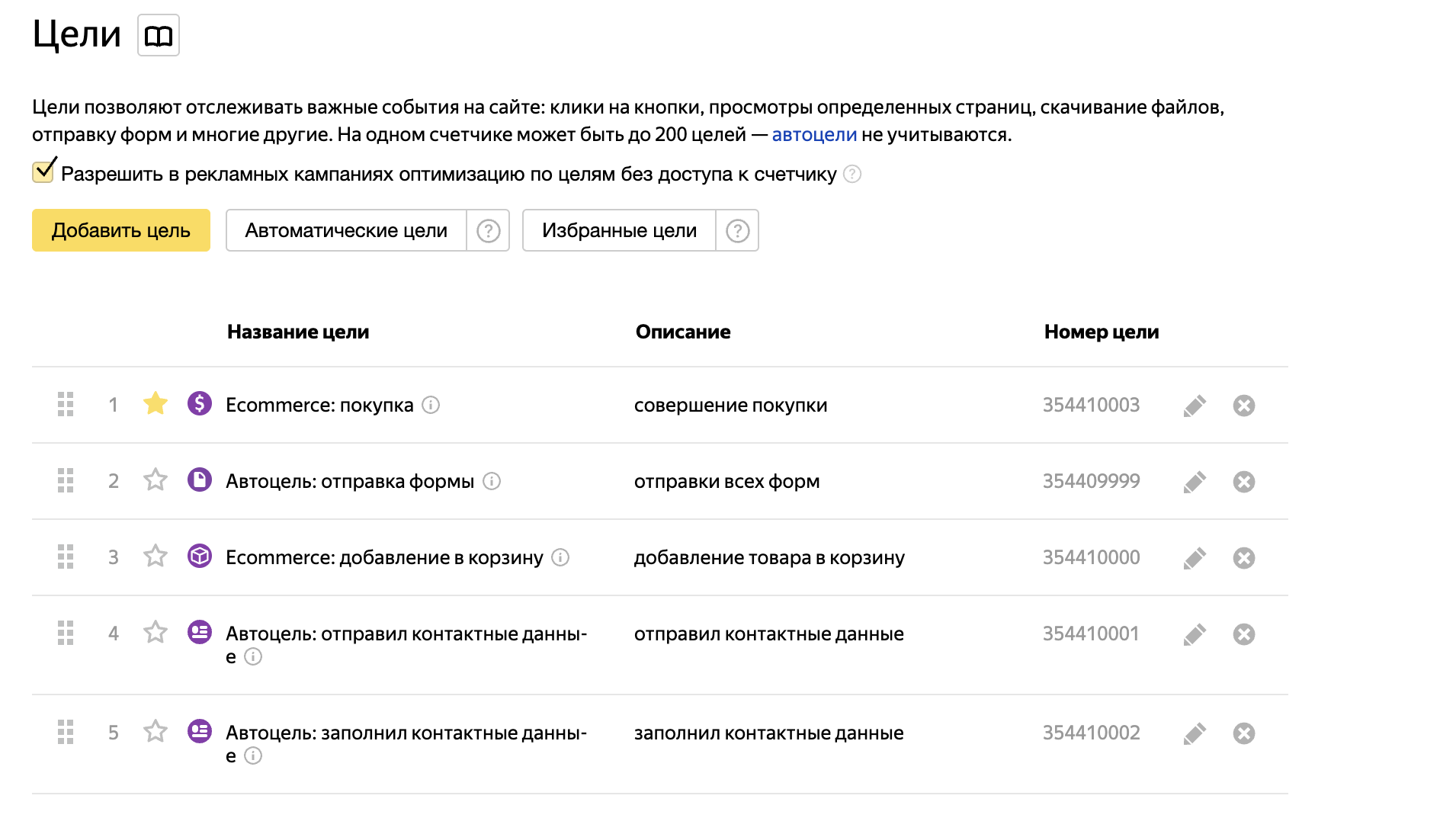 Цели — выберите, по каким целям хотите собирать статистику. Выбранные цели настроятся в вашем счётчике автоматически.