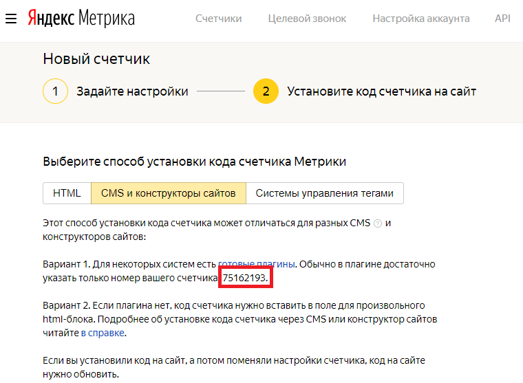 Скопируйте код счётчика — его необходимо будет указать в настройках модуля “Яндекс.Метрика”. Также его можно скопировать со страницы с детальной информацией о счётчике.
