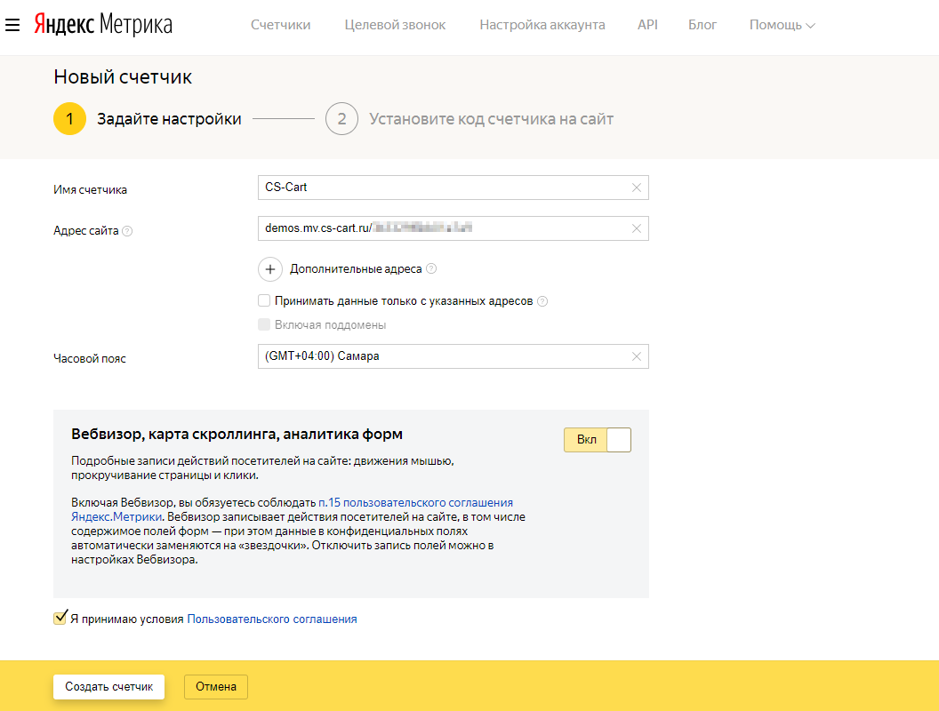 Поставьте галочку согласия с условиями пользовательского соглашения и нажмите Создать счётчик.