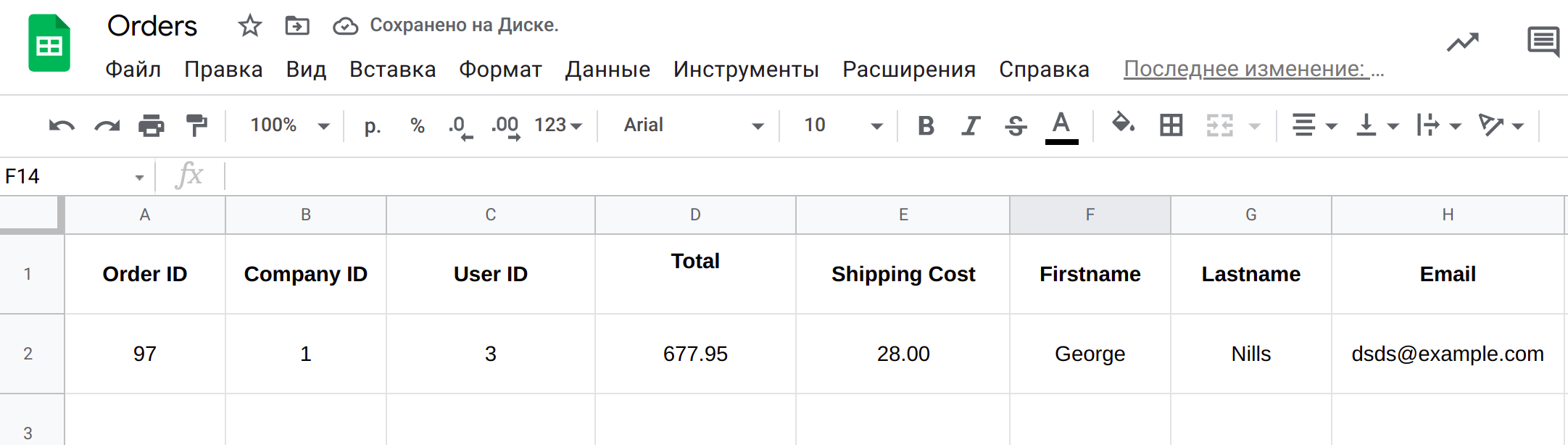Первая строка в Google Таблице c названиями колонок. В данном примере ваш документ может содержать, например такие столбцы: ID Заказа, Имя и Фамилия пользователя, Общая Сумма Заказа и т.д.