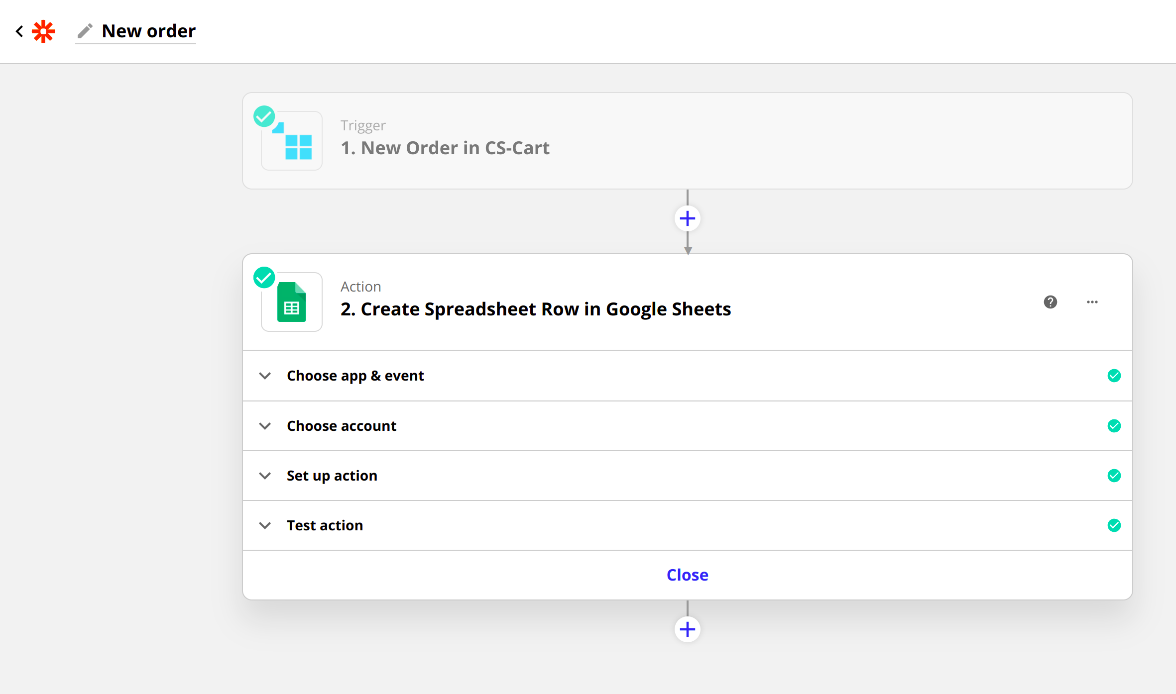 Зап состоит из одного триггера (какое-то событие в CS-Cart или другом приложении) и любого количества действий, вызываемых триггером. Триггером может быть создание заказа, а действием при этом — отправка электронного письма о новом заказе и заполнение Google Таблицы с данными о заказах.