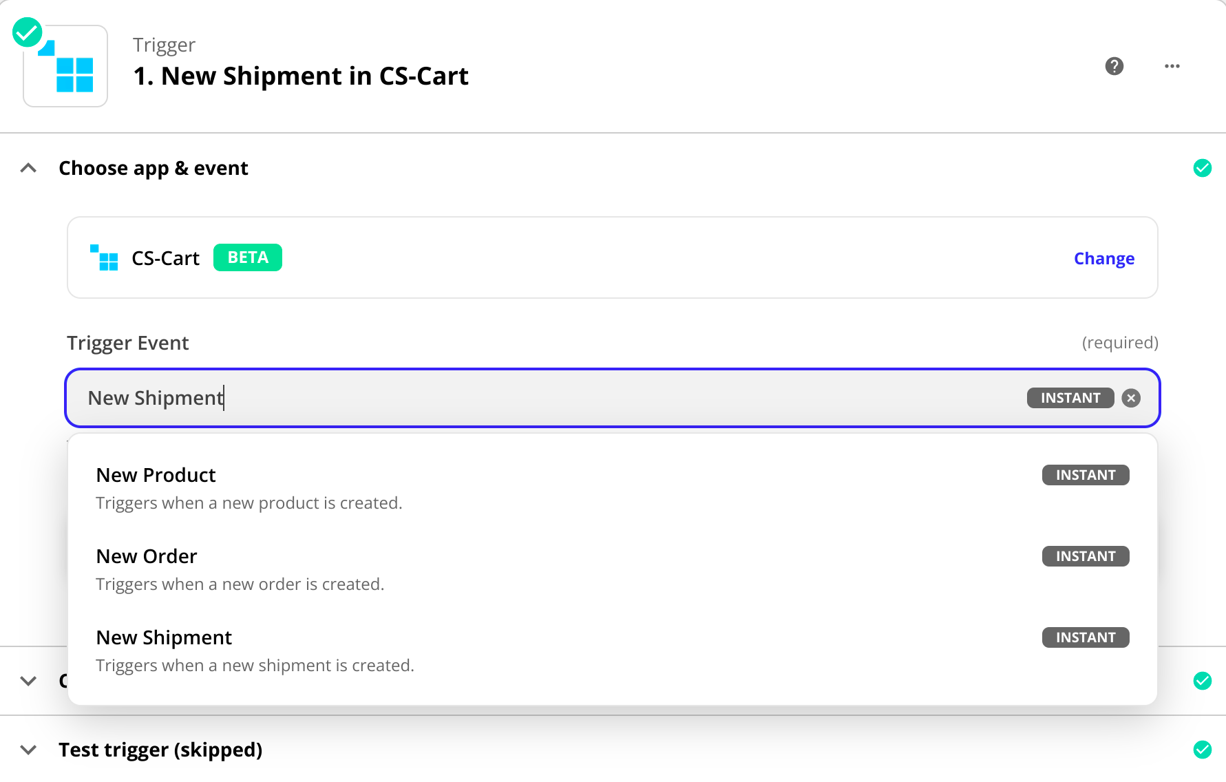 Если вы выбираете CS-Cart в качестве приложения, то триггер будет запускать изменения в магазине, например создание нового заказа.