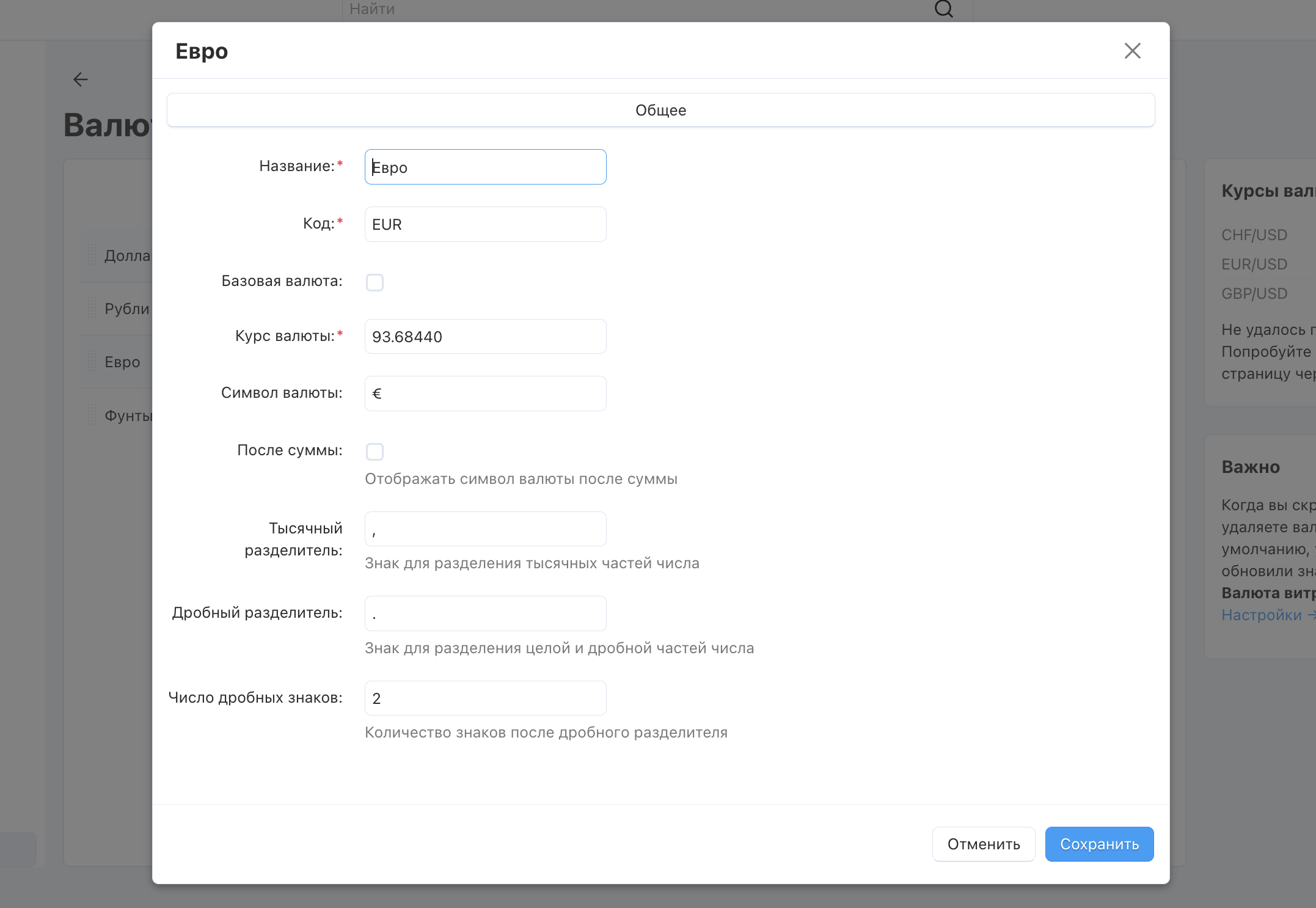Вы можете редактировать валюты на странице Настройки → Валюты.