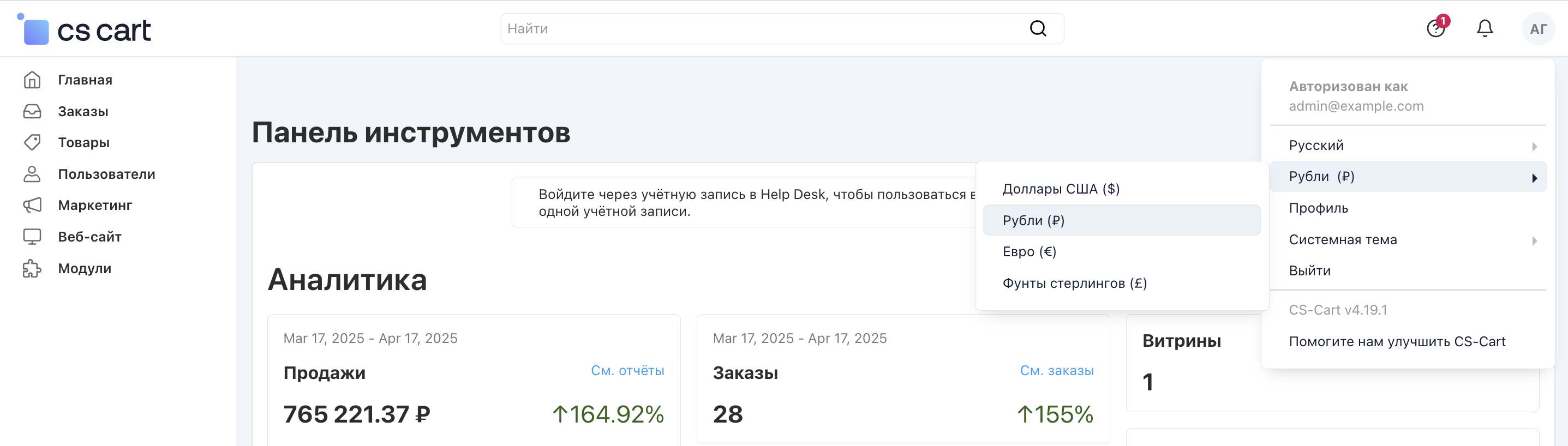 Все цены, добавляемые в панель администратора, по умолчанию считаются указанными в базовой валюте. Русские версии CS-Cart и Multi-Vendor используют базовую валюту для всех подсчётов. Когда это необходимо, результаты подсчётов конвертируются в выбранную валюту в соответствии с указанным курсом валют.