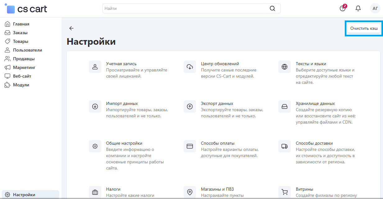 Чтобы очистить кэш, перейдите в Панель администратора, нажмите Настройки → Очистить кэш: