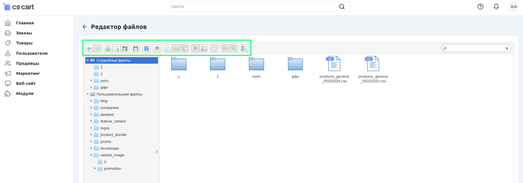 Перейдя на страницу Настройки → Хранилище данных, вы найдете Менеджер файлов, с помощью которого можно напрямую через панель администратора работать с различными файлами.